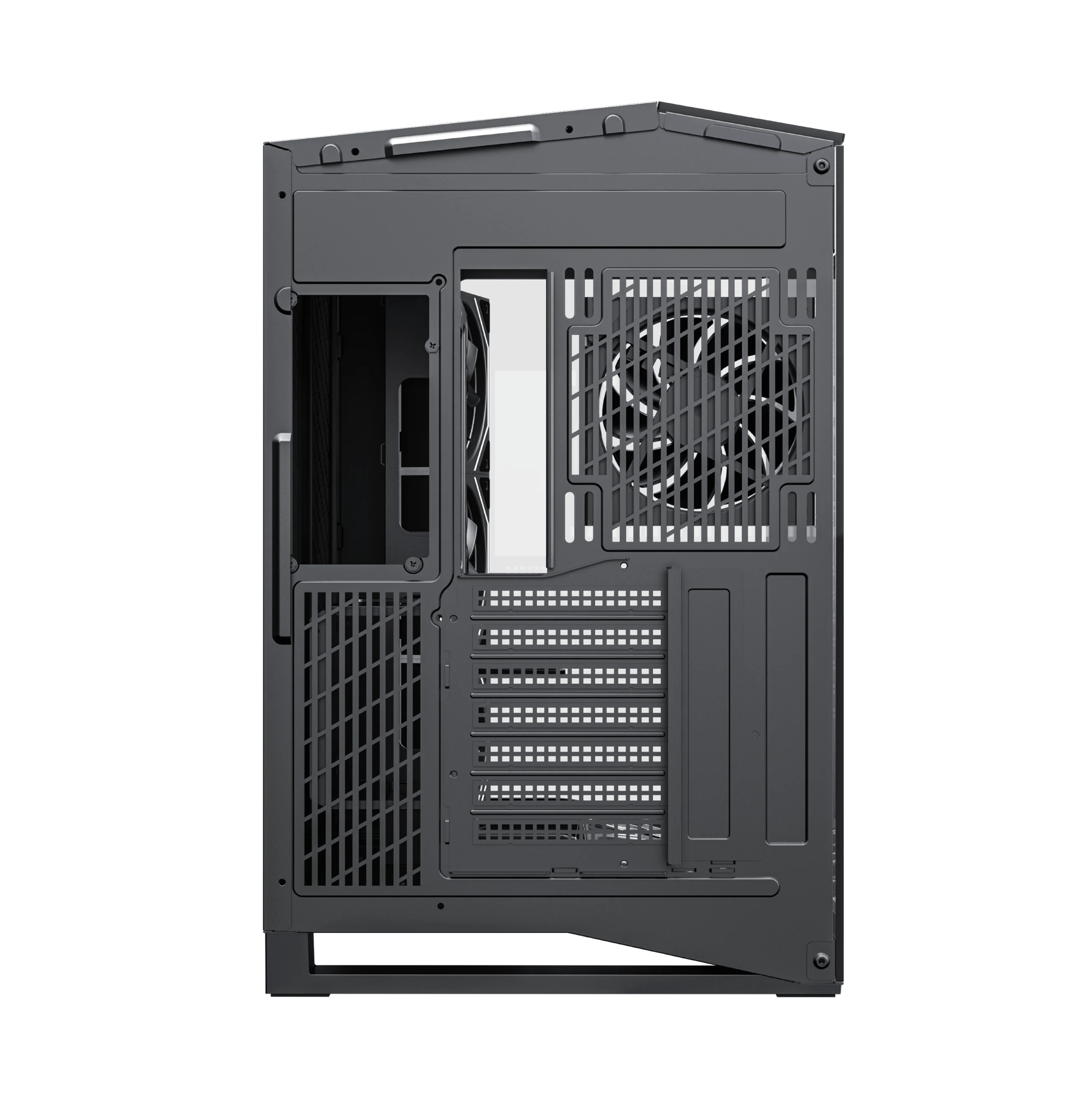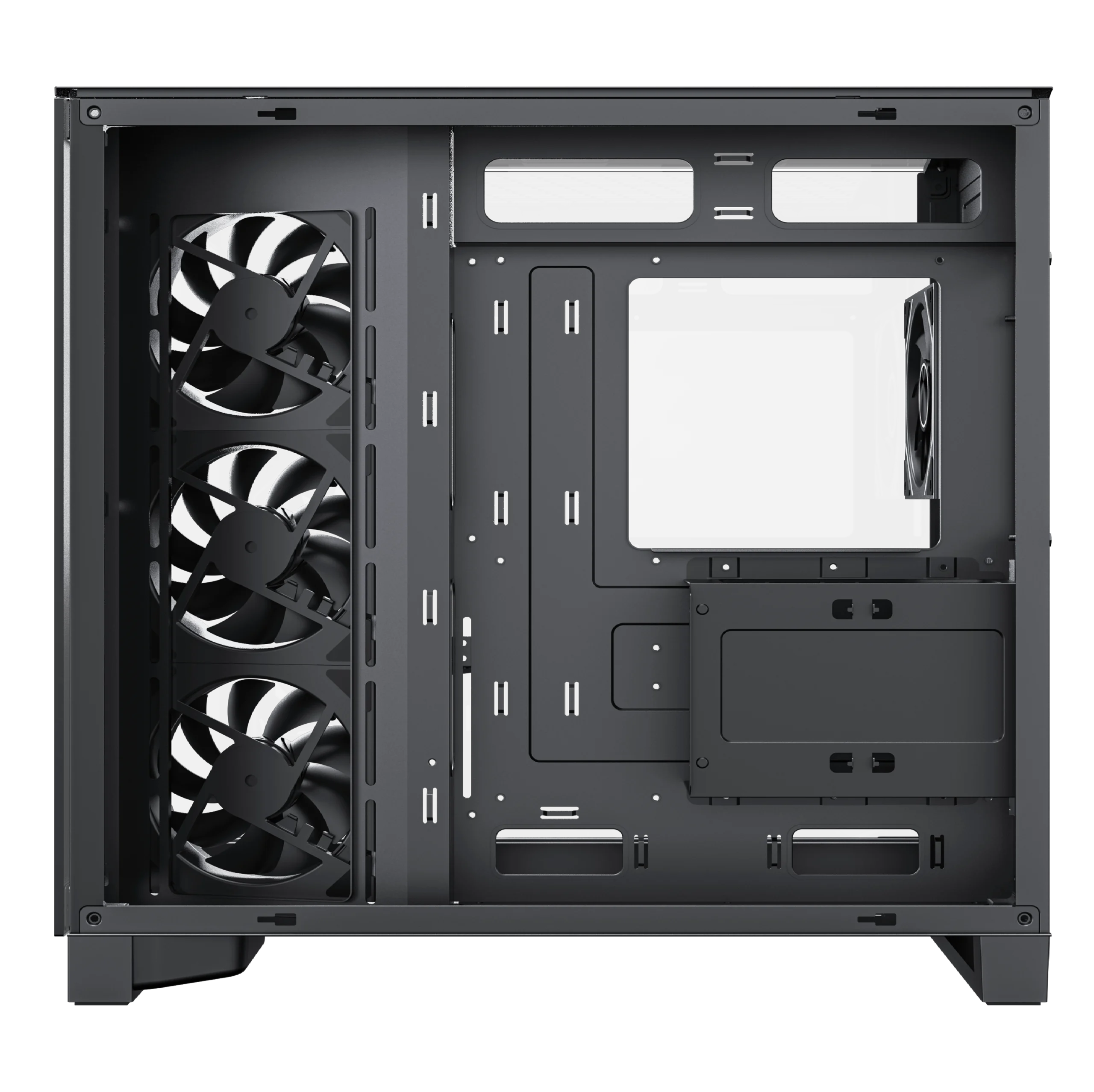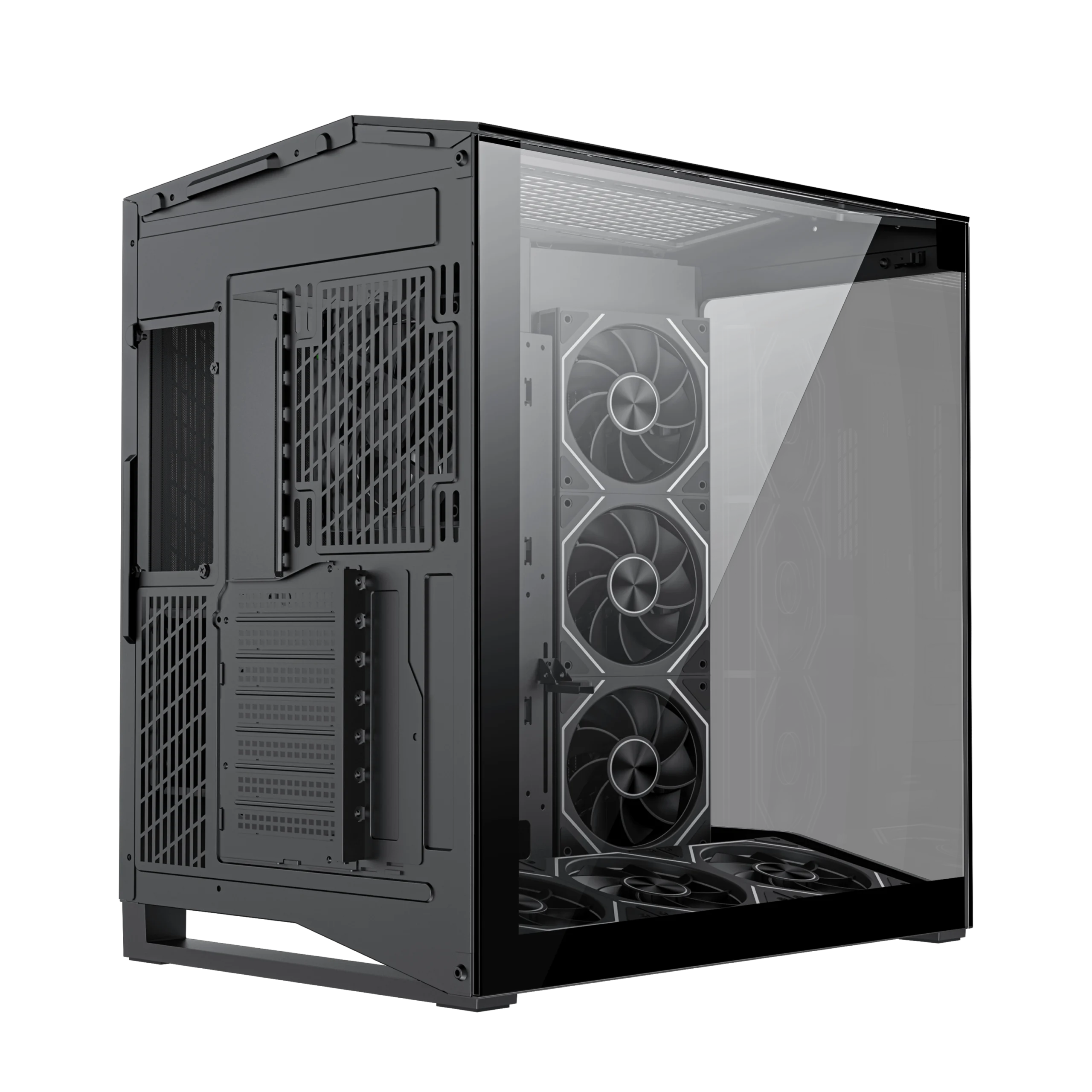 • Three-Sided Tempered Glass: Panoramic view from front, side, and top side panel.